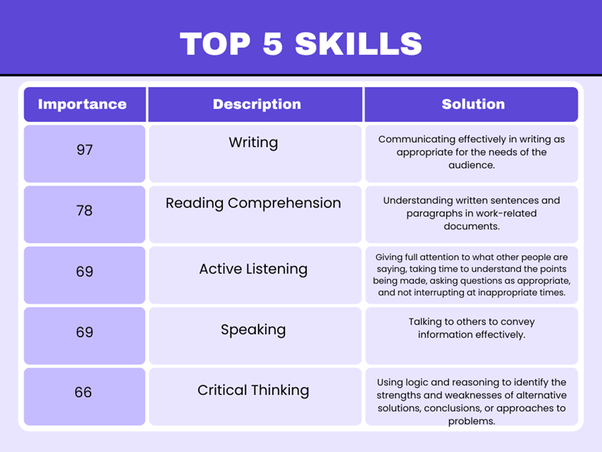 Technical writers possess a combination of strong communication, analytical, and organizational skills. Their most essential ability is to write clearly and effectively when communicating complex information to meet the needs of diverse audiences. They also rely heavily on reading comprehension to interpret technical materials accurately and active listening to gather information from subject matter experts. Speaking skills help them convey ideas and clarify technical details during collaboration. Equally important are critical thinking and judgment, which enable them to evaluate information, identify solutions, and make sound decisions about content accuracy and presentation. Technical writers must also engage in active learning to stay current with new technologies and methods. Strong time management, coordination, and monitoring skills ensure that they meet deadlines, work effectively within teams, and maintain high standards of quality in all documentation projects.